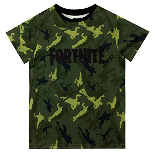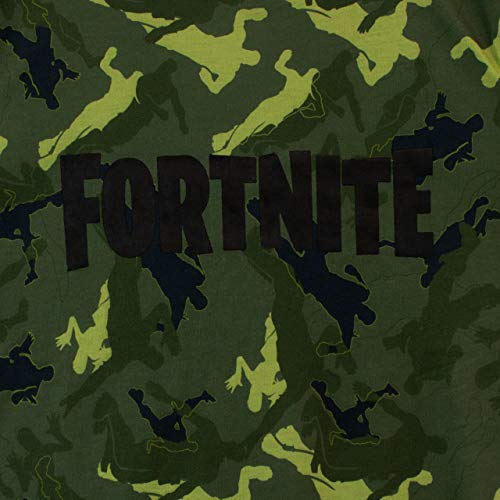 De comfortabele camo top met korte mouwen is voorzien van het Fortnite-logo op Fortnite-spelersilhouetten in de kleuren groen en zwart.