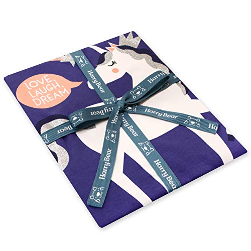 Galoppeer weg in dromenland in deze betoverende eenhoorn-PJ’s! Deze pyjama, ontworpen door Harry Bear, heeft een glorieuze witte eenhoorn verguld met zilveren glitterdetails en ‘Love, Laugh, Dream’ die de paarse top met lange mouwen sieren. Samen met een bijpassende navy pyjamabroek met een charmant eenhoorn-, ster- en kroonmotief en compleet met elastische taille en manchetten voor ultiem comfort, zal je ruiterprinses zeker zoet dromen in deze schattige jammies! Deze pyjamaset van topkwaliteit is gemaakt van superzacht stretchy katoen en heeft een comfortabele pasvorm. We raden aan om een maat groter te bestellen voor een beetje extra ruimte. Afgewerkt met een handgebonden lint om het perfecte cadeau te maken!