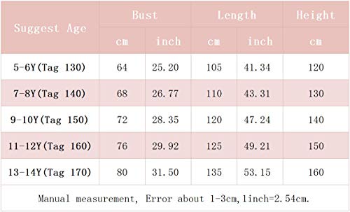 7-8Y(Tag 140) — Buste 68cm/26.77″ — Lengte 110cm/43.31″ — Aanbevolen hoogte 130cm