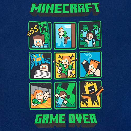 Jongens Minecraft T-shirt. Doe mee met Steve en Alex in een reeks spannende escapades in dit prachtige Minecraft T-shirt! Deze mooie donkerblauwe top toont het dynamische duo in een reeks van 9 prints met een verscheidenheid aan gevaarlijke optredens die je misschien een ‘Game Over’ kunnen verdienen! De voorkant van het t-shirt is ook voorzien van ‘Minecraft’ en ‘Game Over’ gedrukt op de boven- en onderkant van het shirt en wordt aangevuld met een coole ondergedompelde zoom en gele details. Met Creepers, Zombies, Cave Spider en lava pits, zal uw blokbouwer zeker van zijn dat deze verraderlijke tee houden!
