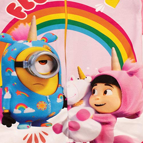Meisjes Minions Onesie. Laten we bananen gaan voor deze Minions in één pyjama! Deze roze onesie is voorzien van ieders favoriete kleine gele vriend Kevin verkleed als eenhoorn met Grus-dochter Agnes omringd door regenbogen, bloemen en de slogan ” It’s so fluffy ”. Compleet met ritssluiting in het midden en zacht fleecemateriaal. Fans van Despicable Me zullen dromen van avonturen met Gru, Margo, Agnes en Edith!