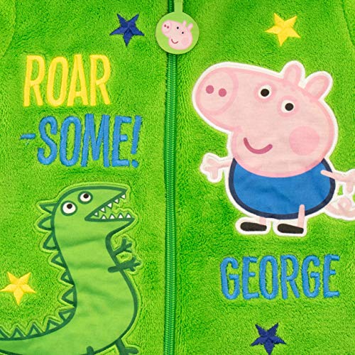 Jongens George Pig Onesie. Minibiggetjes zullen klaar zijn om naar dromenland af te drijven en zoete dromen te hebben op zoek naar dinosaurussen met Peppa en George Pig! Deze groene knorrige slaapzak met Peppa’s kleine broertje George en zijn geliefde speelgoed Mr Dino met de woorden ‘George’ en ‘Roar- sommige!’ geborduurd met sterren. Compleet met een supercoole ritstrekker met George aan en een bontcapuchon met Dino’s ogen en 3D-tanden! Je kleine Peppa-fan staat klaar om naar bed te draven in deze brullende pyjama.